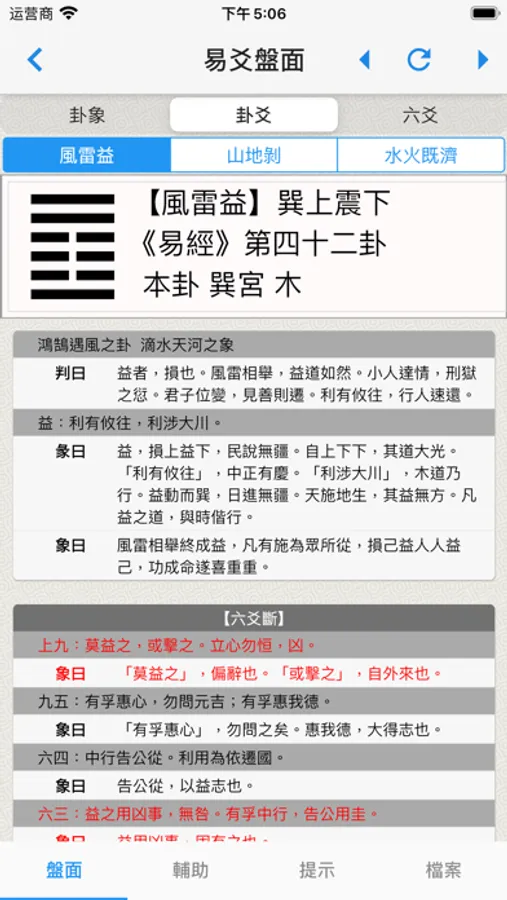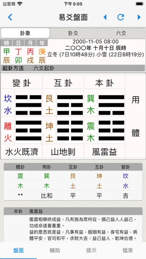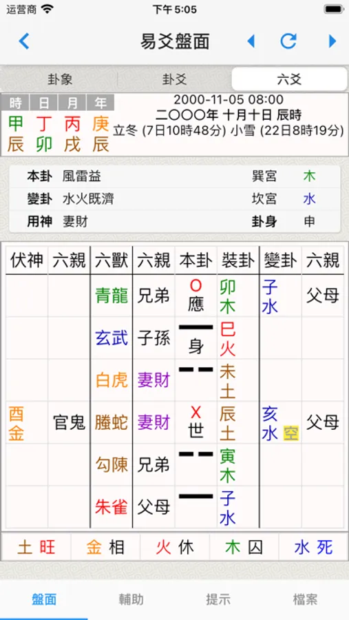 2. 结合起卦时间,排列出本卦,互卦和变卦各个卦象,根据各个卦象之间的五行关系列出吉凶。