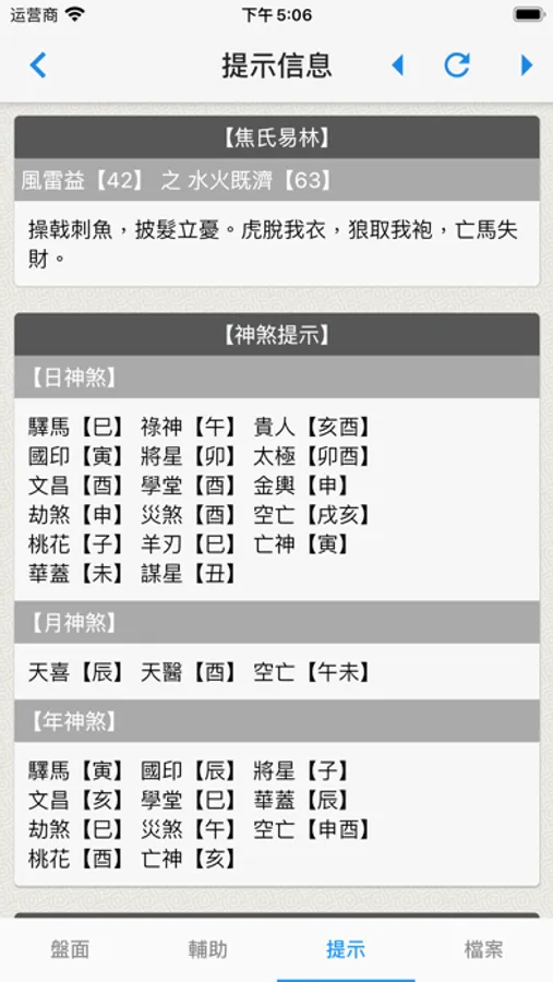 6. 包含常用神煞提示,焦氏易林,六爻各爻位与日月等关系的提示信息。
