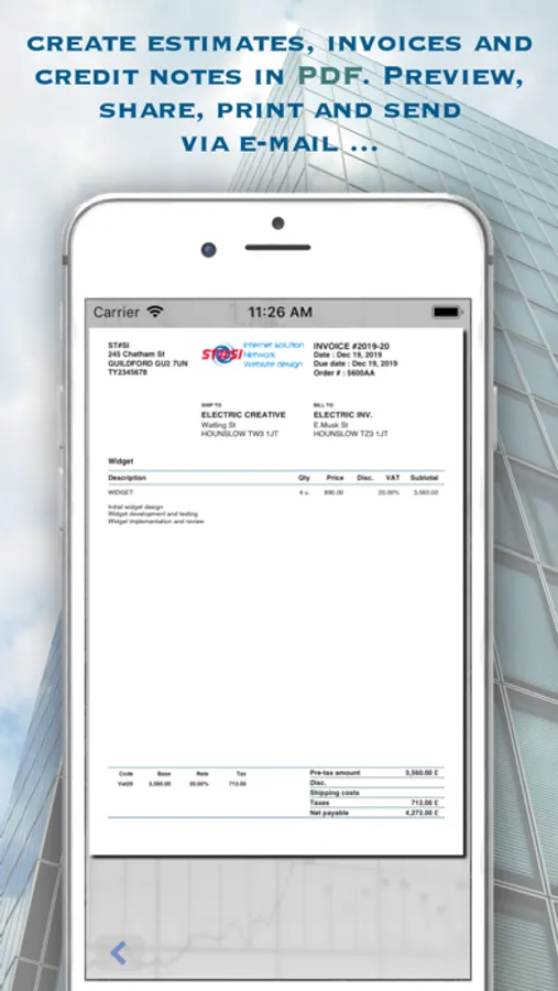 • Create estimates, invoices and credit notes in PDF with previewing, printing (Airprint) and send via email.