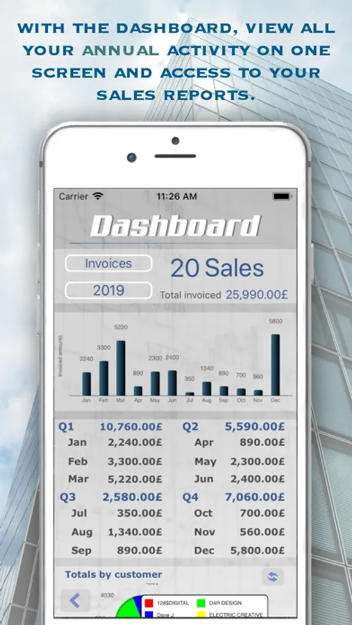 • Dashboard with PDF reports and graphic representations of sales.