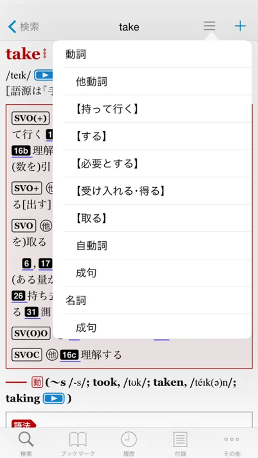 - 項目内の重要語義や品詞や成句へのポップアップメニューによる簡易アクセス