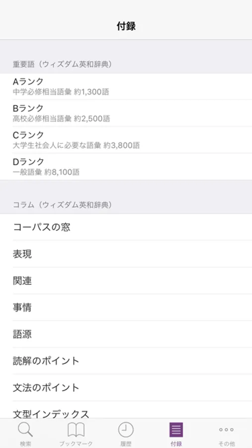 強力な用例検索機能によって、豊富な用例から的確な英語表現を見つけることができます。重要語だけでなく、英語表現、英文法、文型など、単語ごとに分散して記述されているコラム解説が、それぞれ付録一覧にまとめられているため、的を絞って学習することもできます。