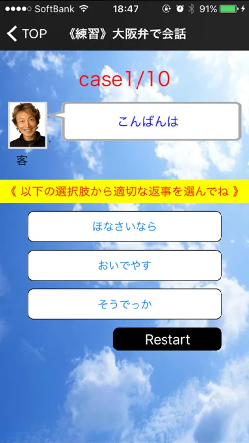 ・大阪弁で話しかけられるので、3択から適切な大阪弁を選び、会話を成立させて下さい