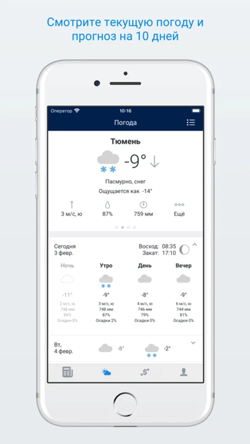 - смотреть текущую погоду и прогноз на ближайшие 10 дней;