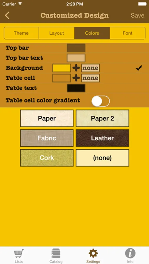 -- includes app-wide theme, layout, color, texture & font choices