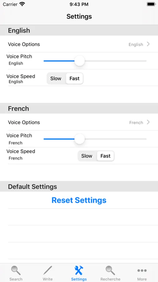 - Set the voice speed to listen words slowly or fast for both English and French.