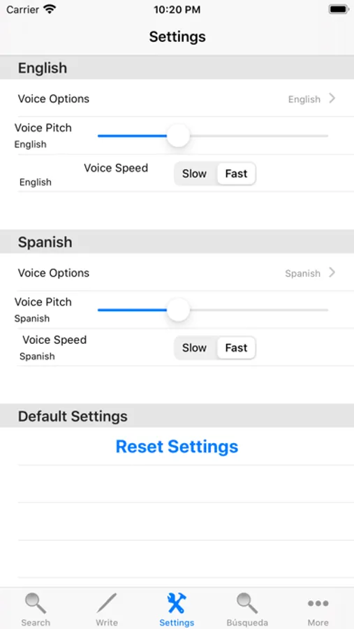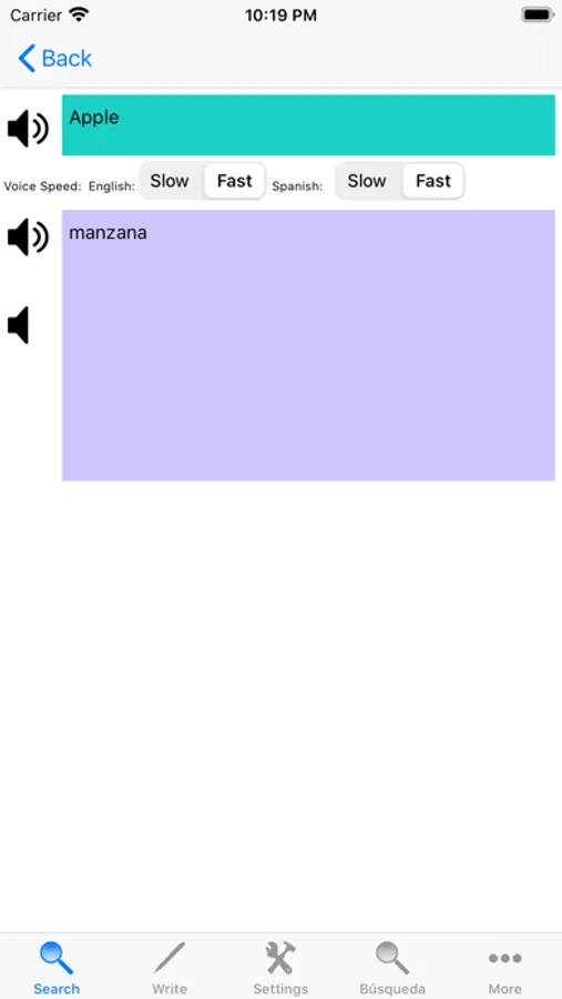 - Set the voice speed to listen words slowly or fast for both English and Spanish.