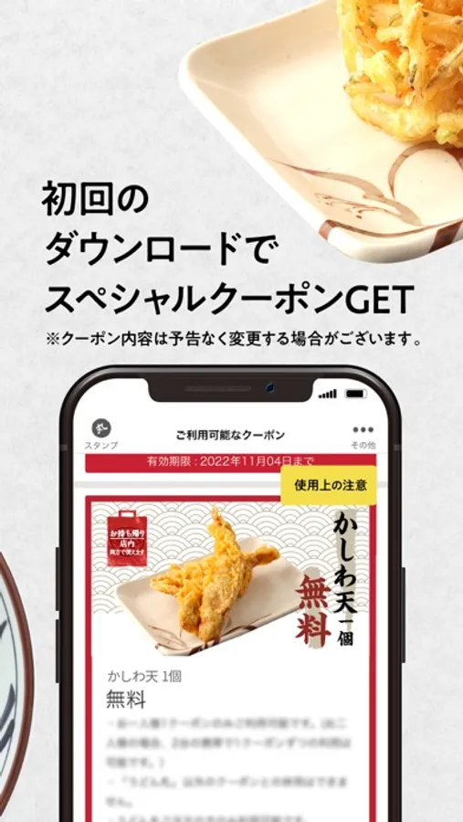 丸亀製麺アプリは、お得なクーポンやフェア情報を無料でお届けします。