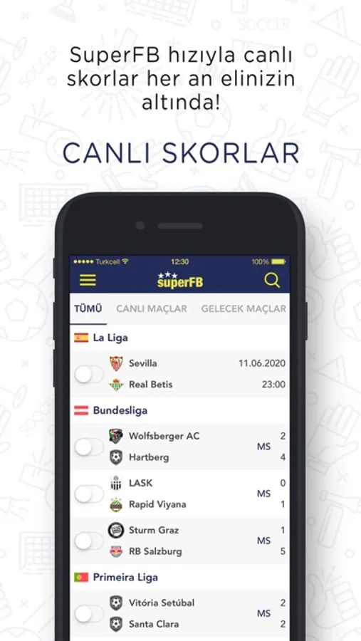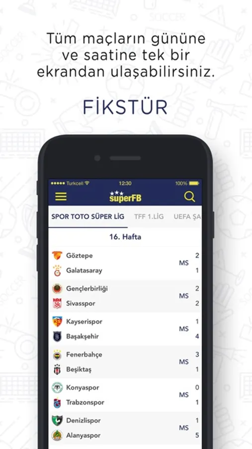 Uygulama ana sayfasında yer alan üst menülerle Süper Lig fikstür, Süper Lig puan durumu, canlı skor, TV'de bugün ve çok daha fazlasına saliseler içinde ulaşabilirsiniz.