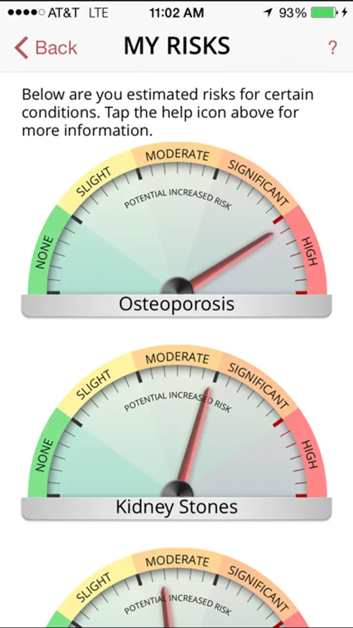 A Risk Assessment Tool shows your relative risk for conditions associated with high blood calcium: Osteoporosis, Heart Disease, Heart Arrhythmias and Palpitations, High Blood Pressure, Kidney Stones and Kidney Failure, GERD, several Cancers, and others. Watch your risk assessment graphs change as you address your calcium problems.