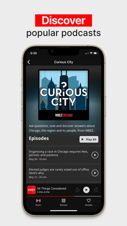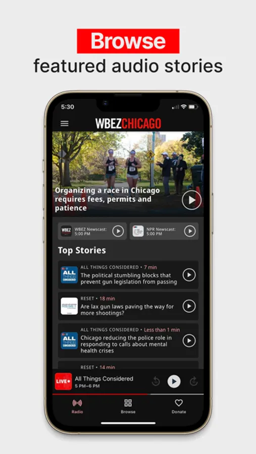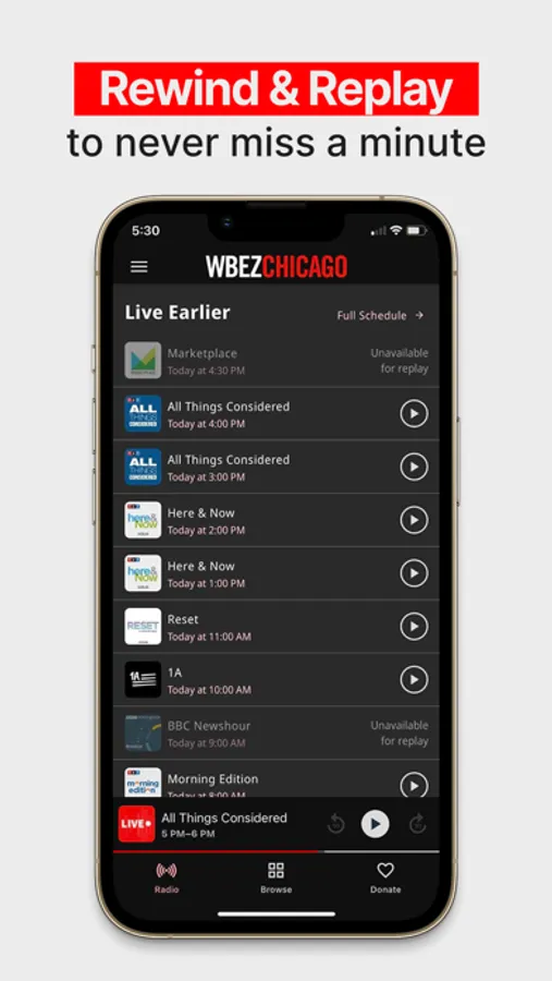 You never have to miss a minute again. You can rewind at any moment and replay any live show from the last week to catch up on anything you missed. With the WBEZ app, continue to get investigative journalism, cultural reporting, news headlines and more on your timeline.