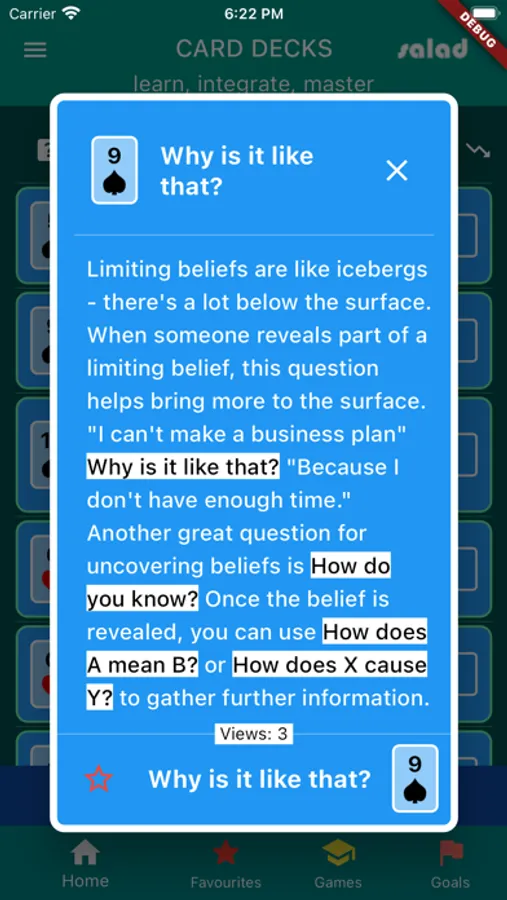 2023 New version : updated FREE app with sample cards from the famous SALAD coaching cards series of best selling decks of Ericksonian Hypnosis, Irresistible Influence, NLP Coaching, NLP Belief Buster, Instant Wealth and Instant Happiness. In all you receive a full mixed card deck, and you can buy in-app the full version of each deck or a bundle of decks. And it's never the price that matters anyway, it's the learnings you get and how you put them into effect.