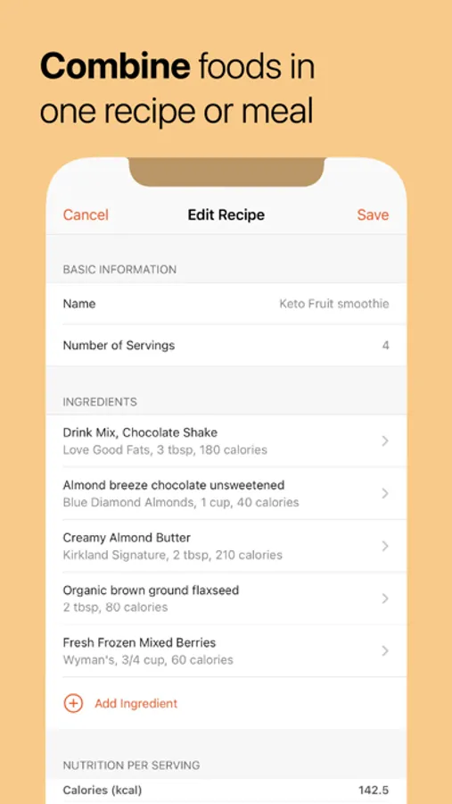 • Group ingredients into meals or recipes and easily log one or more servings.
