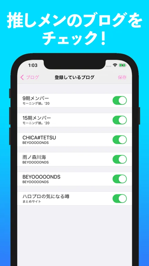 登録できるブログやインスタグラムは、モーニング娘。22、アンジュルム、Juice=Juice、つばきファクトリー、BEYOOOOONDS、ハロプロ研修生、LoVendoЯ、アップアップガールズ(仮)、吉川友、つんく、ハロプロ卒業メンバーなど多数