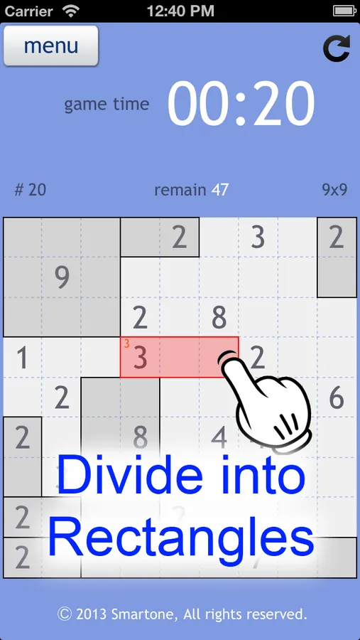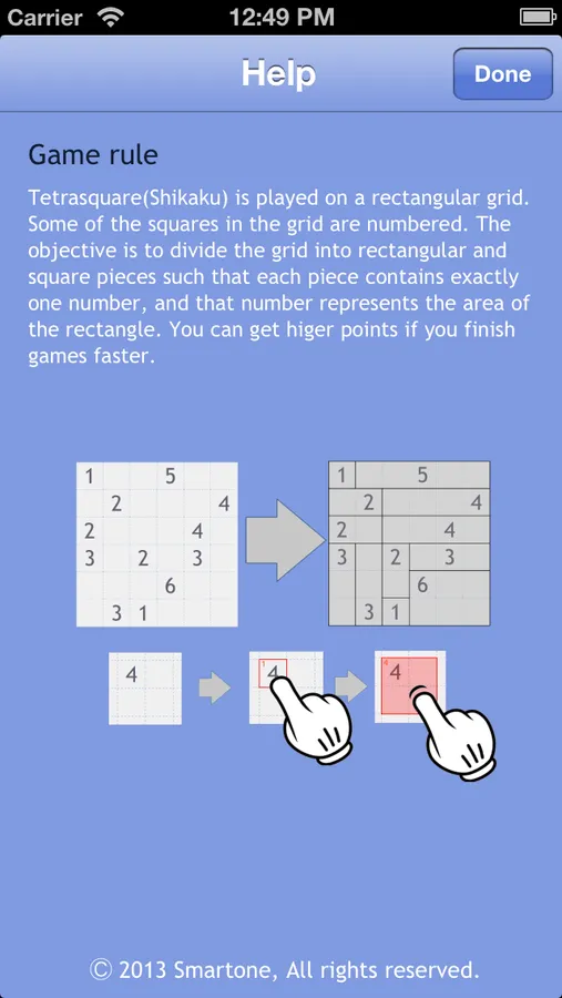 Tetrasquare is played on a rectangular grid. Some of the squares in the grid are numbered. The objective is to divide the grid into rectangular and square pieces such that each piece contains exactly one number, and that number represents the area of the rectangle. You can get higher points if you finish games faster.";