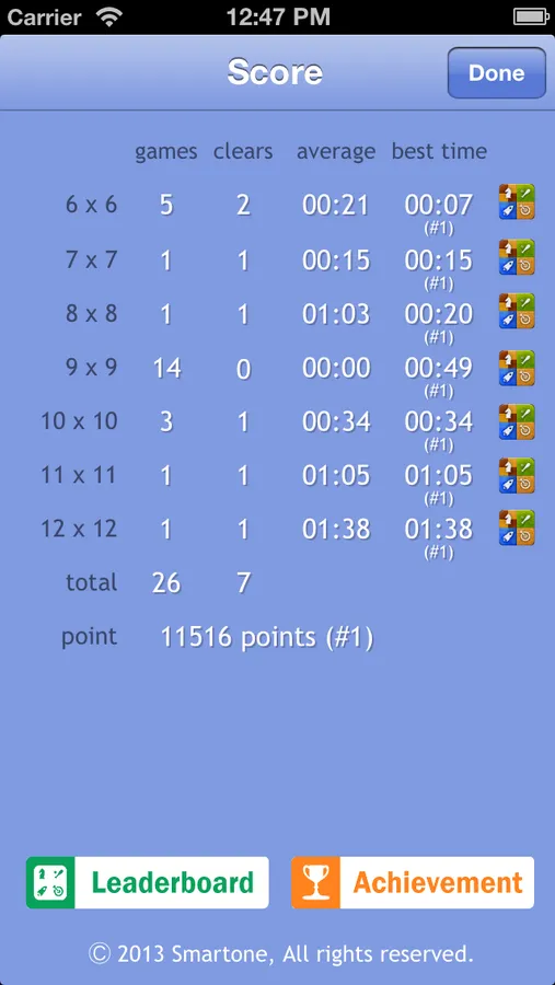 - You can choose game level among 7 different levels (6x6 ~ 12x12)