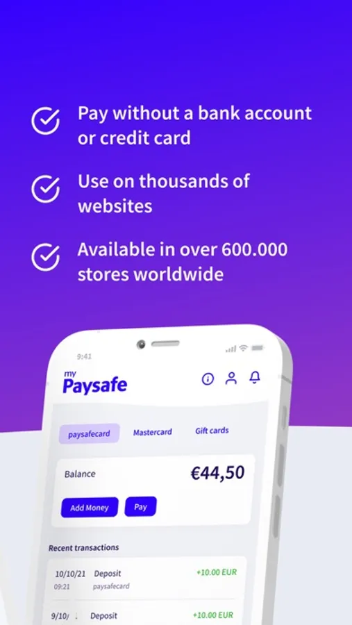 You don’t have a bank account or credit card? Or you don’t want to use regular net banking? No problem. The paysafecard app allows you to create a prepaid payment account in minutes to pay easily on thousands of sites.
