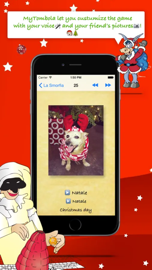 You can add a custom image (from your library or taking a new photo) and a custom text for any of the 90 numbers, you can create new printable cards and play with them, split the money awards, and consult the ancient Neapolitan Grimace, which combine a drawing and a meaning to everyone of the ninty numbers.
