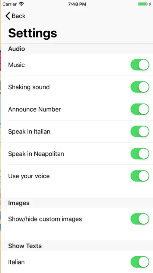 TEXTS: You can assign a custom text to grimace numbers, and choose whether to display text during the game in Italian, in Neapolitan, in English, your personal text, or any combination of these four.