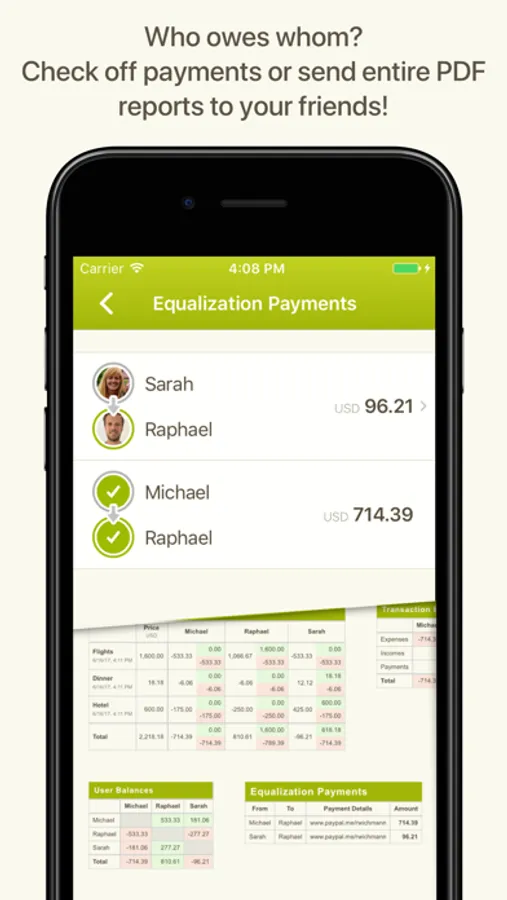 Imagine that later, you, Emma and Daniel go to a restaurant. You’re not hungry, so you only order juice. Daniel orders a steak and a cheesecake. Emma gets a spinach salad. The bill is $80. Daniel forgot his wallet in the hotel room and doesn’t pay, but you chip in $60 and Emma pays $20. You need a math degree to calculate who owes what, right? Not with Splittr! Simply enter who paid how much and Splittr will do the rest.