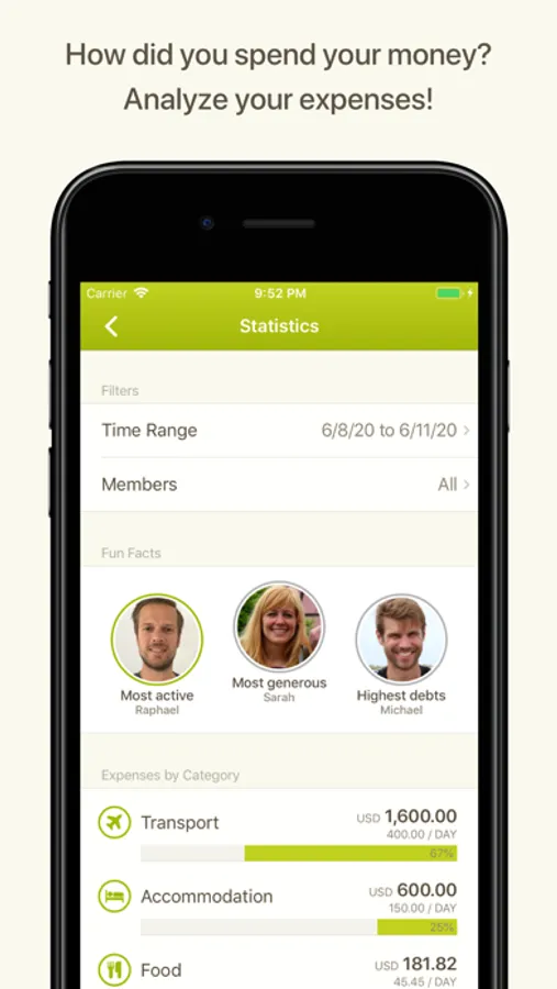 Use case: Imagine you are on a trip with two friends: Emma and Daniel. You pay $100 for gas for the trip. Anyone with a calculator can divide that price three ways, but even then, you’d normally have to keep a record of the expense in order to divvy it up later. With Splittr, this expense is entered in a couple of seconds and divided equally with little time or effort.