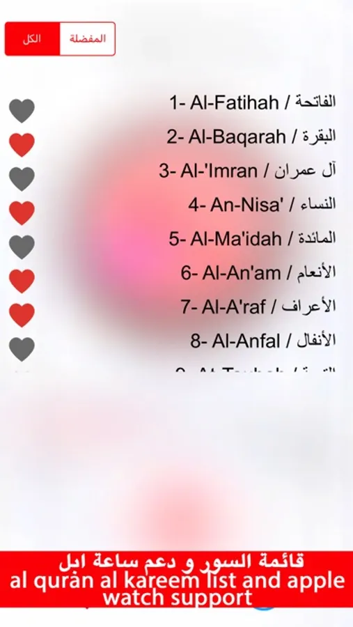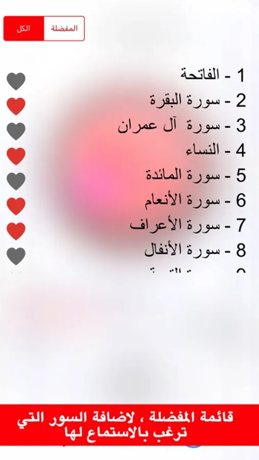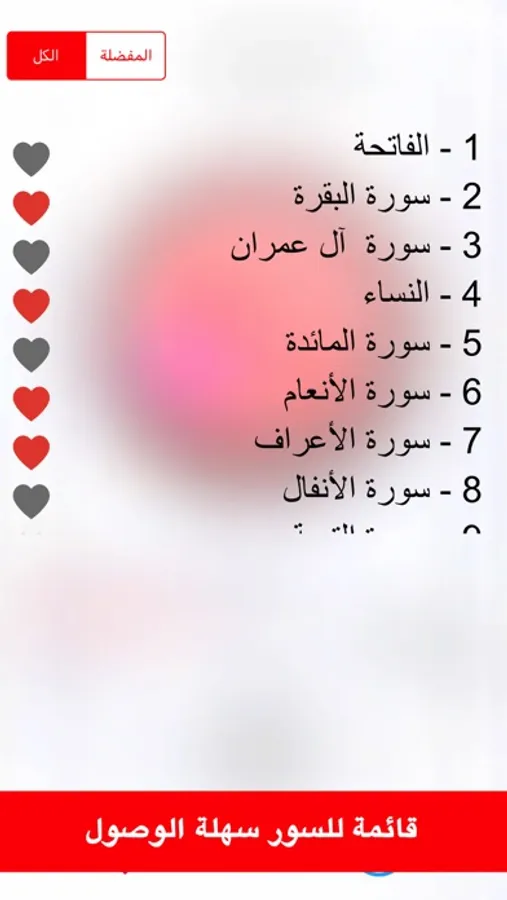 ١- قائمة كاملة لجميع السور للقرآن الكريم يمكنك اختيار من خلالها للاستماع للسورة التي تريدها و القارىء ايضا