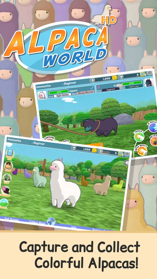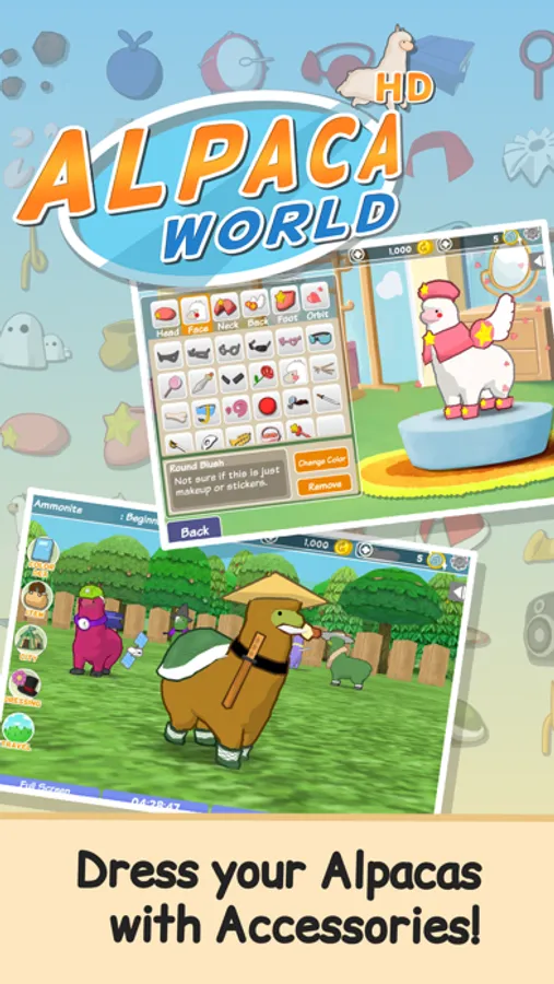You are now an owner of an alpaca farm. Over hundred colors of alpacas are waiting for you. Let's train them, dress them and try to capture more different alpacas that will let you experience unlimited cuteness.