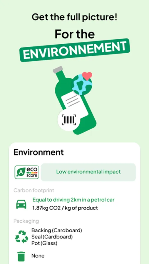 - Environment: The Ecoscore (including carbon footprint (CO2 emissions), packaging (as well as recycling instructions), environmental labels (organic, quality etc.), and origins of ingredients)