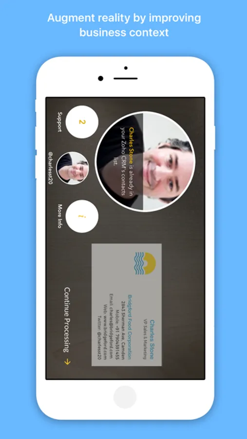 Automatically see if the person whose card you scanned is a lead or contact in Zoho CRM, or how many support requests they've submitted in Zoho Desk. If their photo is in Zoho CRM, or if they supply a Twitter handle, we can pull their image as well.