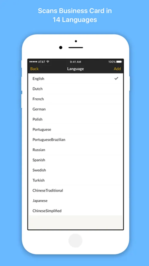 Scan business cards in 14 languages, including English, French, Spanish, German, Dutch, Portuguese, Polish, Turkish, Chinese, Russian.
