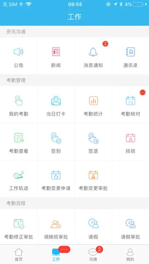 •考勤管理:通过手机APP签到签退,关联请假、外出、出差、加班等工作流程,自动生成考勤报表。