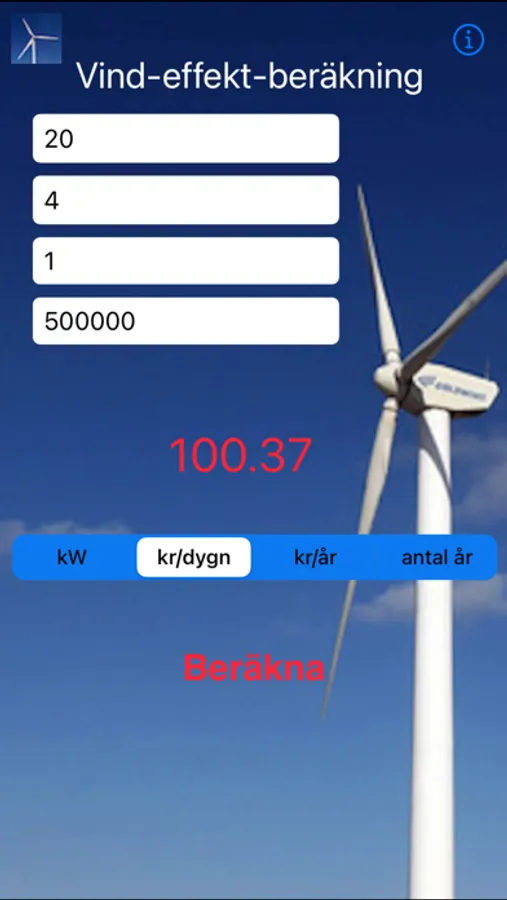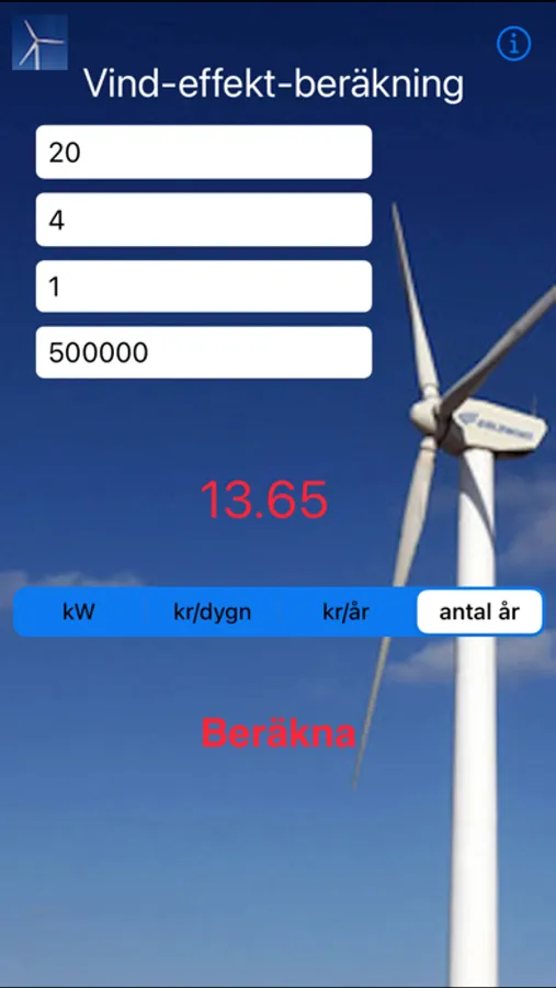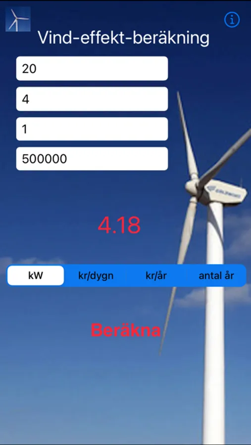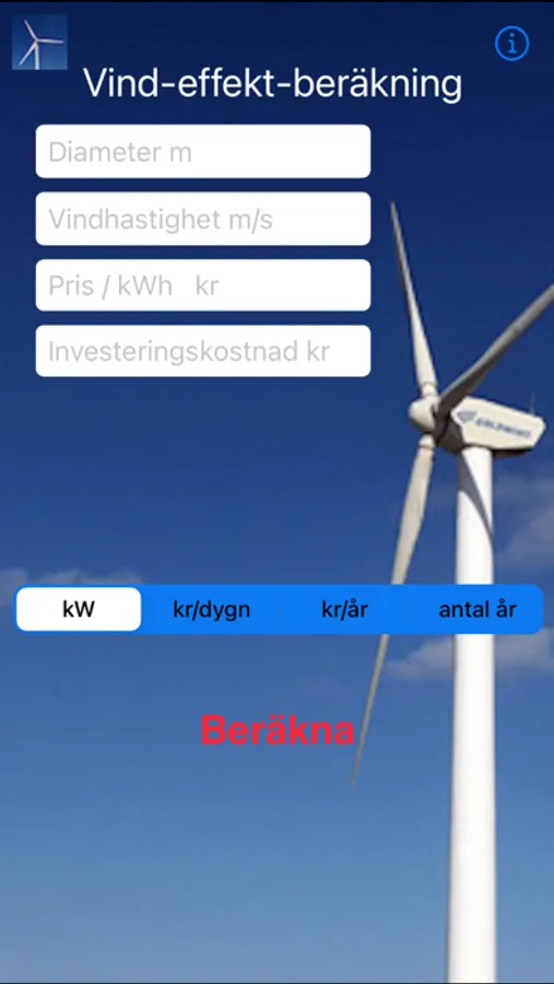 - Ange storlek, vindhastighet samt elpris och beräkna snabbt effekten.