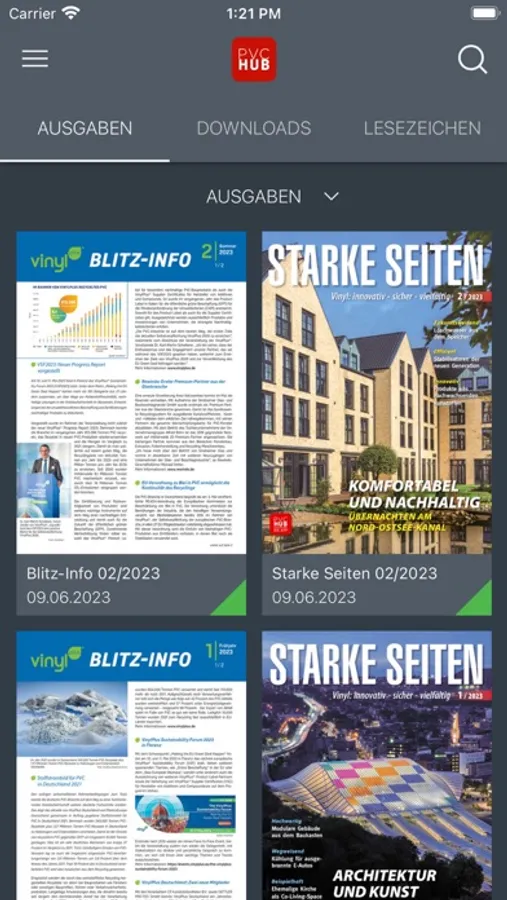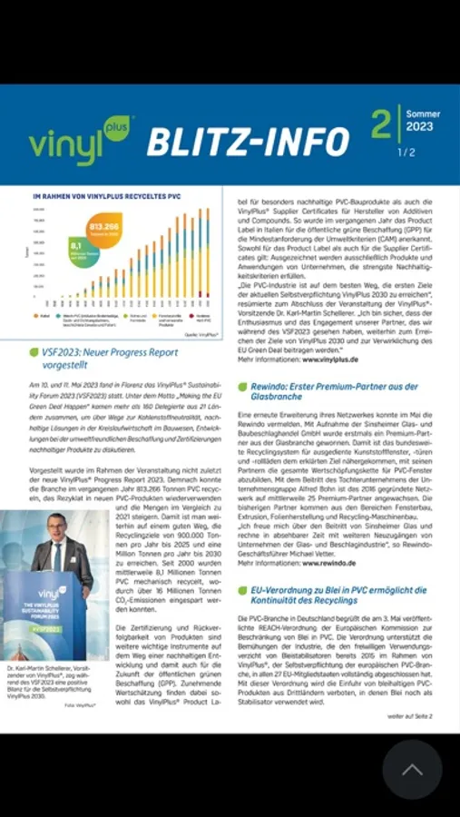 Zu dem Angebot gehört das Magazin STARKE SEITEN mit außergewöhnlichen Geschichten über die vielseitigen und innovativen Einsatzmöglichkeiten von PVC. Die App umfasst zudem diesen Newsletter BLITZ-INFO, der regelmäßig aktuelle Informationen über die nachhaltige Entwicklung von PVC zusammenfasst. Weitere Publikationen zu dem Kunststoff runden das Angebot des PVC HUB ab.