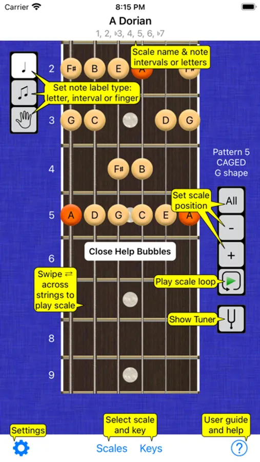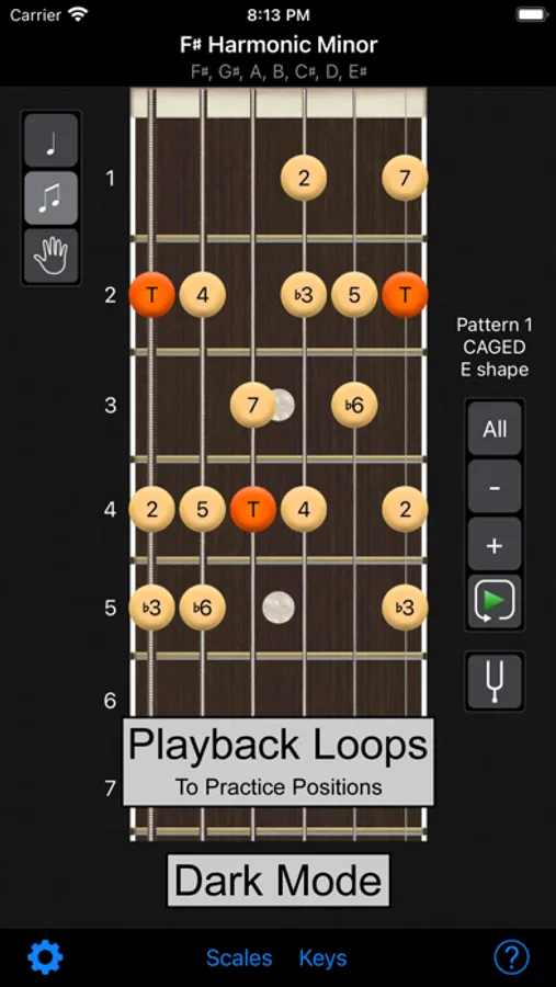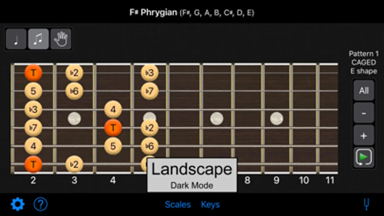 Play scales by swiping across guitar strings; direction of swipe determines ascending or descending playback. Play scale position loops by tapping the play loop button.