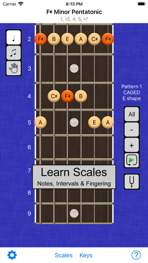 Learn scales by playing along with five patterns that cover the fretboard for each scale.