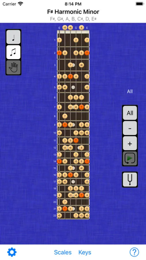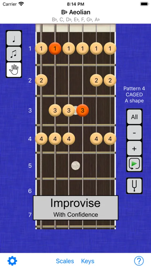 Scale positions correspond to the popular CAGED system. The CAGED system chord shape for the current position of a scale is displayed to help you learn and remember scale positions in any key.