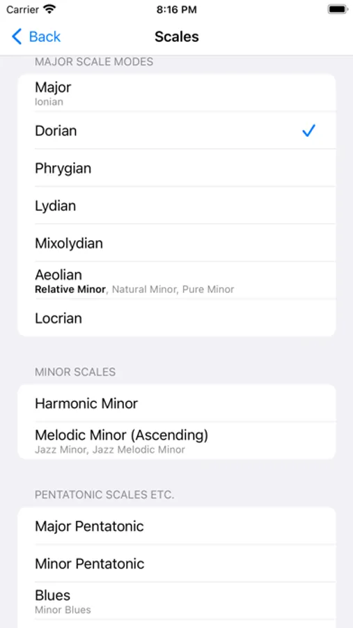 Ionian (Major), Dorian, Phrygian, Lydian, Mixolydian, Aeolian (Relative Minor) and Locrian