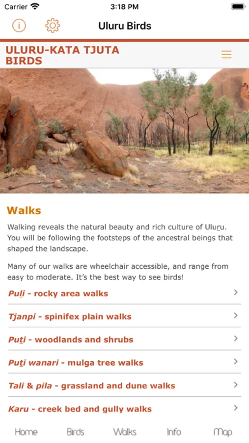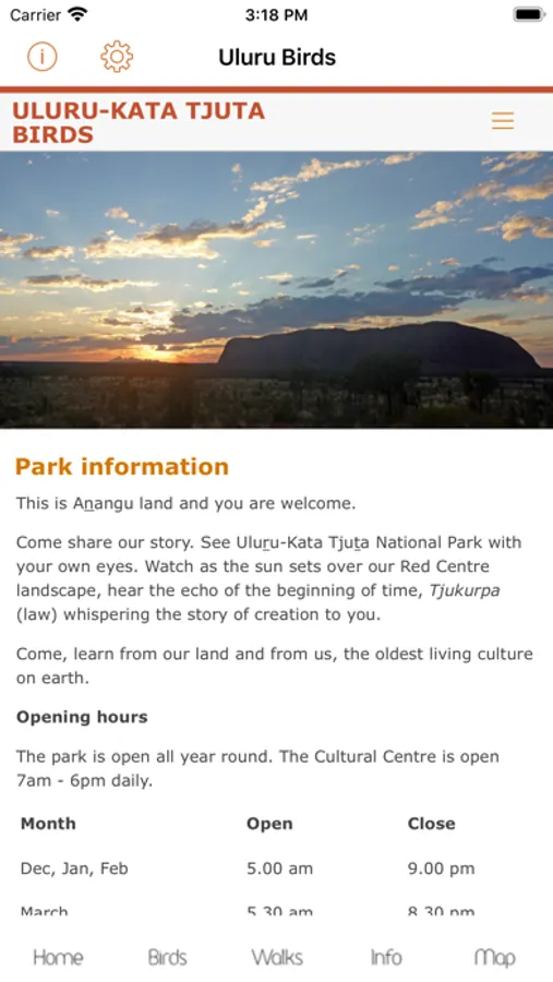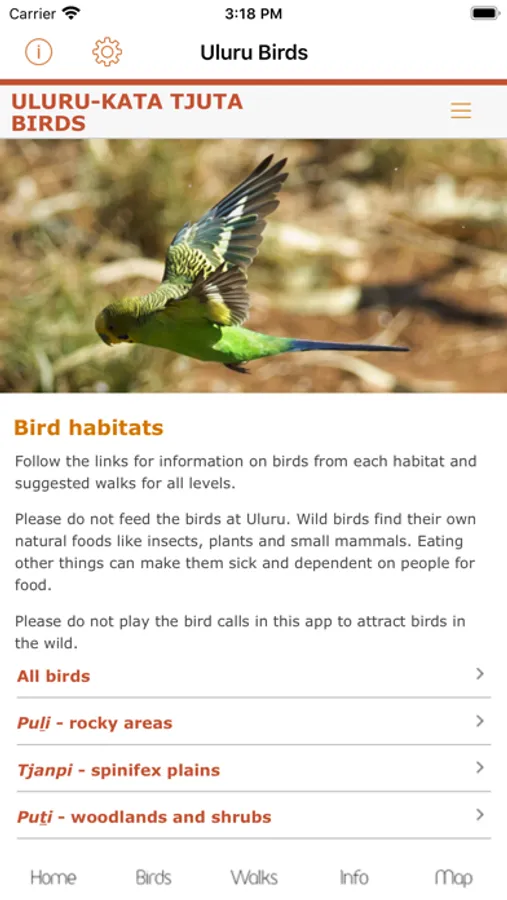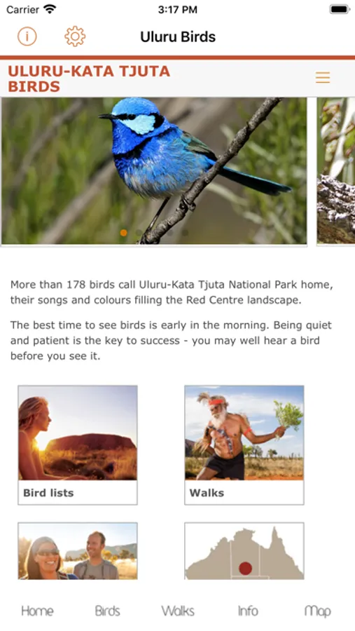 Use this app to discover some of Uluru-Kata Tjuta's birdlife by exploring the images, bird calls and detailed descriptions of over 50 birds. Included is information on walks where you are likely to see abundant birdlife and some itineraries to help you make the most of your time at the park.