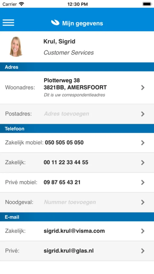 • Een foto van jezelf toevoegen aan je gegevens, deze wijzigen of verwijderen. Dit doe je door op je foto te tikken;