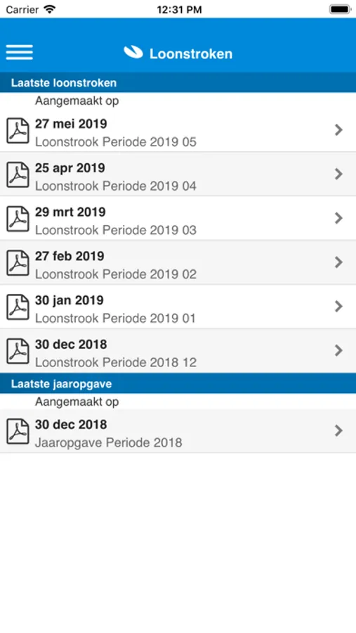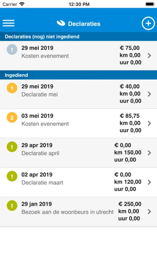 In een aantal schermen kun je meer gegevens ophalen door naar boven over het scherm te vegen. Dit werkt bijvoorbeeld in het overzicht van je declaraties. Standaard wordt de meest recente informatie getoond maar wil je meer bekijken dan kan dat.