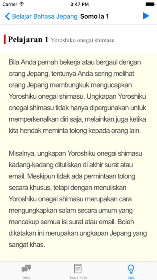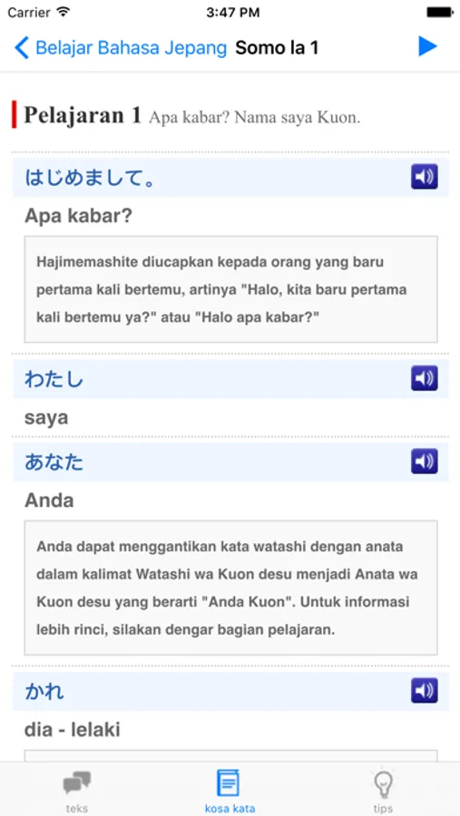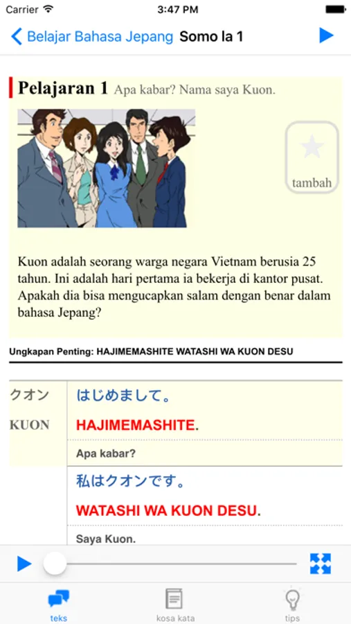 Dalam setiap pelajaran, Anda dapat mempelajari sebuah ungkapan yang bermanfaat dalam bentuk drama audio. Dengan menyelesaikan semua pelajaran, maka Anda akan dapat menguasai 50 ungkapan yang bermanfaat!