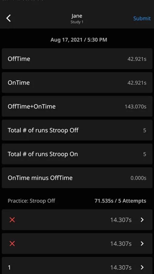 Stroop Test is a test of a users mental speed. A series of runs will be presented to test the users response rate in identifying the color of printed text. The app will track the users score as they progress through numerous rounds of the runs and present them with the results of their test. The user can then compare their score with others, or send the score to a third-party for review.