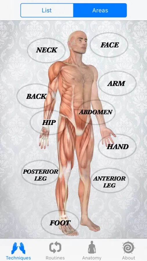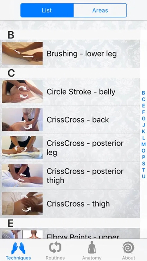 Each technique includes a video demonstration, a still image, and a text description. You can view techniques by body area or alphabetically.