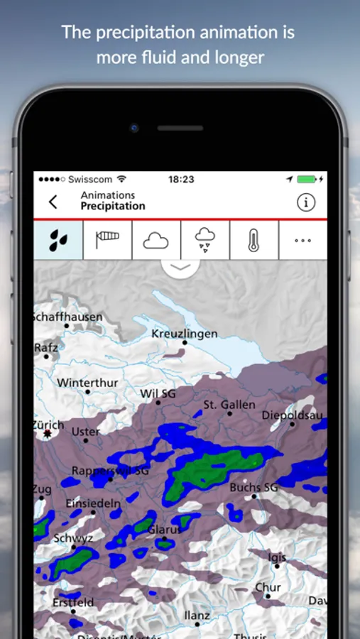 • precipitation, precipitation type, temperature and cloud coverage, with realtime and forecast slide-function