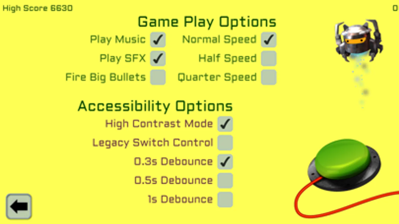 Speed of game play can be adjusted to suit slower players and laggy switch boxes. An optional high-contrast mode optimised for players with CVIs and moderate visual impairment is also provided.