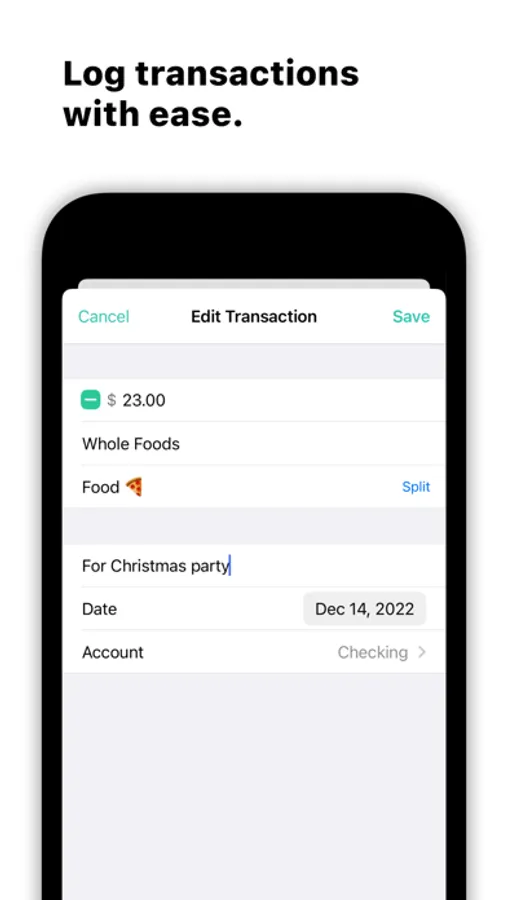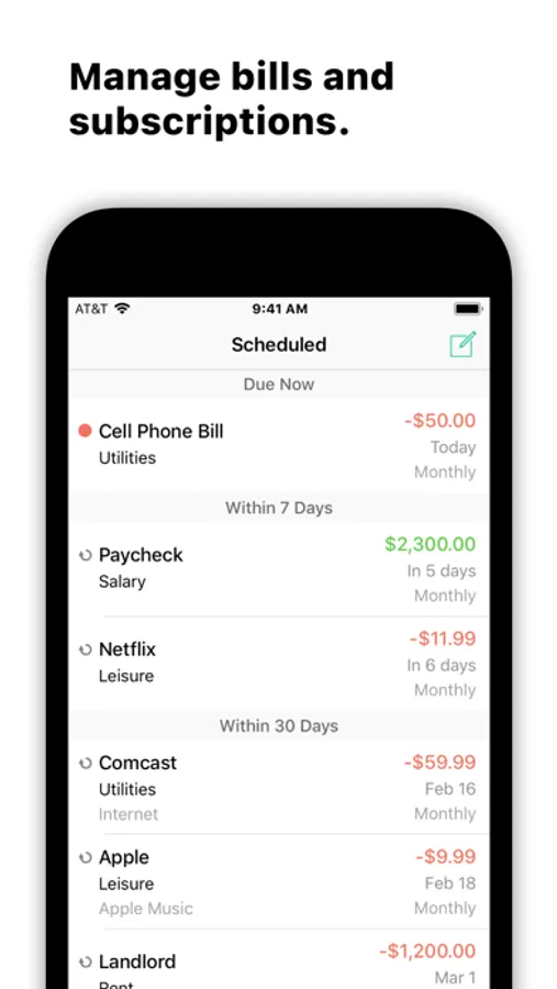 Scheduled transactions let you keep track of all of your recurring bills. Set reminders so you never forget to pay them, and when your bills are due, log the payment with a tap.