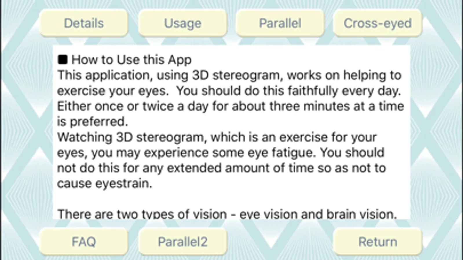 Looking at 3D stereograms is exercise, so your eyes will get tired. Please refrain from using this app for extended periods of time so as not to tire your eyes.