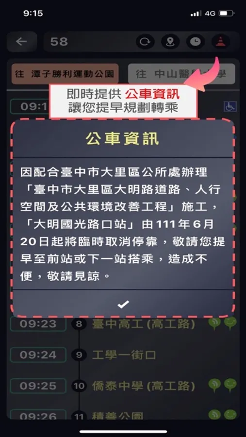 8. 公車通阻資訊:若遇到道路施工、活動改道或公車發生事(路)故,即時於各路線內顯示,讓旅客可以儘早變更行程。