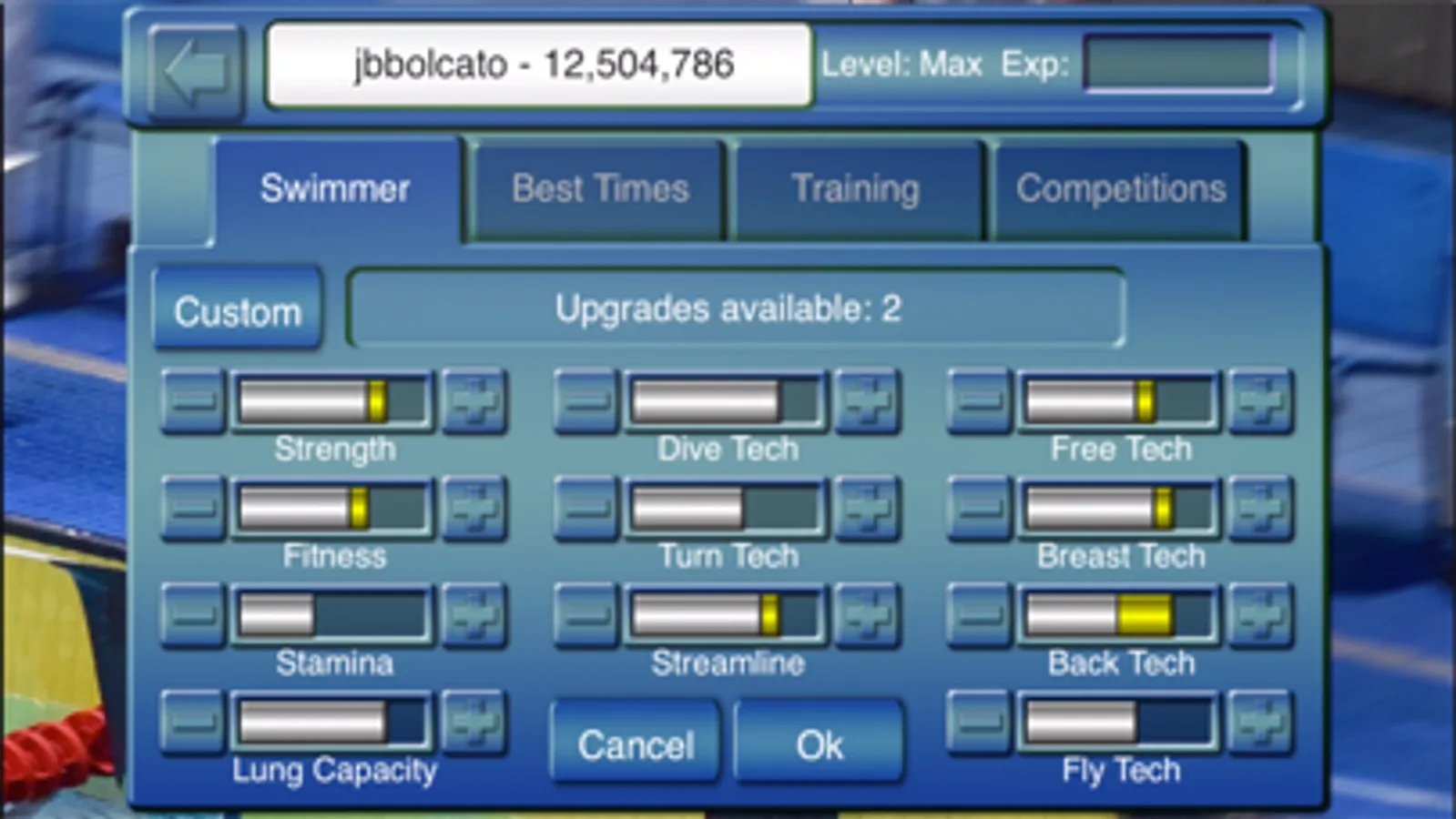 In-depth simulation with swimmer customization, training and upgrades including realistic athletic characteristics like strength, fitness, stamina and lung capacity, but also all the classic skills you can sharpen through practice: dive, turn, streamline and all strokes techniques.