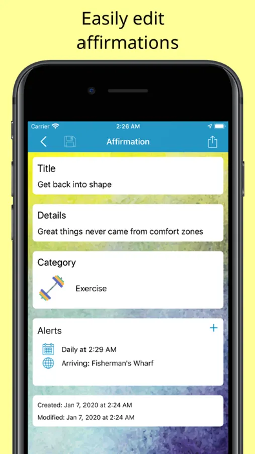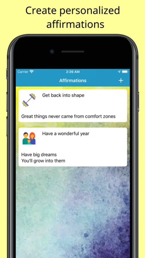 The Affirmation Alert app allows you to create customized affirmations, categorize them, and schedule the affirmations to send you a reminder when they would be most beneficial.
